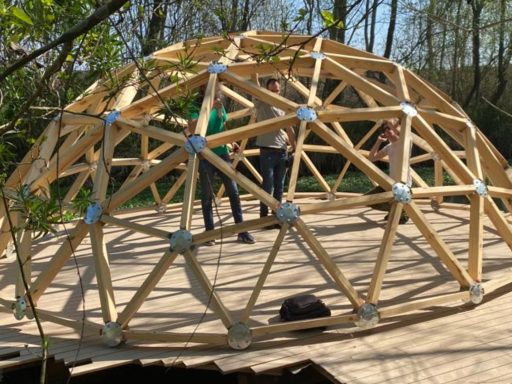 Al final de la película Melancholia de Lars Von Trier, una madre le propone a su hijo hacer una carpa mágica para refugiarse de la inminente colisión de un planeta contra la Tierra. Juntos recogen palitos para armar lo que parece un tipi en lo alto de una colina y, una vez finalizada la precaria construcción, se instalan dentro de la estructura a esperar de piernas cruzadas. La madre llora de angustia; el hijo cierra los ojos, cree en la magia. Mundo Disco, la instalación de Diego Bianchi, parece un homenaje a este pequeño refugio, solo que en clave domo geodésico: una hermosa burbuja que parece inspirada en Buckminster Fuller y sus ideas sobre un sistema de estructuras en tensión y la necesidad de diseñar una vivienda para la humanidad, eficiente, económica y sustentable. Mundo disco es un iglú acuático, una semiesfera de madera recubierta por llantas de autos recicladas que flota en un arroyo forrado por redonditas de agua similares a camalotes. Rodeado por una reserva de plantas embriagantes y con una tacuarita azul que da saltos sobre una rama caída, el pequeño búnker contiene en su interior una biblioteca con libros sobre naturaleza, arquitectura y sustentabilidad.