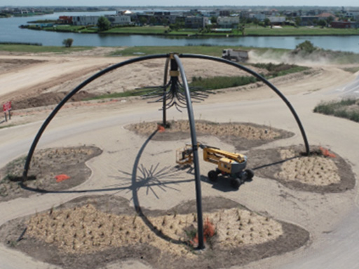Una araña hecha a partir de luminarias urbanas; el ruso Victor Shlovsky llamaría a eso un gesto de extrañamiento. La buena literatura está construida a partir de ese mismo proceso. La escritora Silvina Bullrich llamaba a los cables negros que colgaban del ascensor de su casa «las grandes serpientes» y a los firuletes en las rejas antiguas «los anzuelos». ¿Cómo ver por primera vez lo que vemos siempre? ¿Cómo sacar a nuestra mirada del modo automático? ¿Cómo quitarle las cataratas a la visión, cuando un día cualquiera no diferenciamos entre el sillón, el florero y nuestra familia? Regalar una nueva mirada es lo que Eugenia Calvo intenta producir en sus obras. No es la primera vez que la artista crea una imagen desconcertante a partir de algo cotidiano: las luces de la calle se agrupan formando la cabeza y el abdomen de un bicho inmenso, unos arcos de hierro simulan sus patas. Es una idea eficaz porque te lleva al desarreglo inmediato de los sentidos: de golpe, las grúas de la municipalidad que trabajan en la calle, se vuelven pterodáctilos; no las habíamos visto antes, pero ahora no podemos dejar de verlas. Calvo no se limita a dar sorpresas; de ser así, su arte no duraría más de una primera aproximación. Hay algo de la tradición gótica de lo inquietante en lo familiar, que también atraviesa sus obras. Los muebles de una casa que arman una barricada, un muestrario policial de palos, cachiporras y garrotes, un puré de papas que se transforma en nube ominosa. Son pasillos de la mente, que se cubren de objetos embrujados. La araña de Calvo no está sola, pertenece a una familia de artrópodos famosos: la inolvidable araña de patas peludas que aparece en el cuento de Felisberto Hernández El balcón; la araña Maman de Louise Bourgeois, cuyos finos hilos acunan nuestra psiquis o, como escribía Emily Dickinson: «La Araña como Artista que nunca ha sido contratada/si bien su Mérito sin par/está de sobra confirmado». Las cosas, como se nos aparecen y no como sabemos que son. El arte de Eugenia Calvo es un buen antídoto para el riesgo permanente al que estamos expuestos: el de tomar al mundo y a nosotros mismos por sentado.